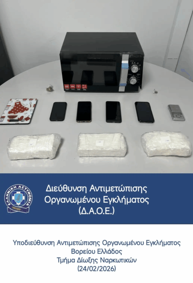 Κατά την παράδοσή του σε σπίτι σε περιοχή της Θεσσαλονίκης οι τρεις ακινητοποιήθηκαν και από την έρευνα στο εμπόρευμα, βρέθηκαν και κατασχέθηκαν επιμελώς κρυμμένες, εντός φούρνου μικροκυμάτων, 3 συσκευασίες, οι οποίες περιείχαν 2.927 γραμμάρια κοκαΐνης.