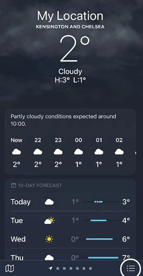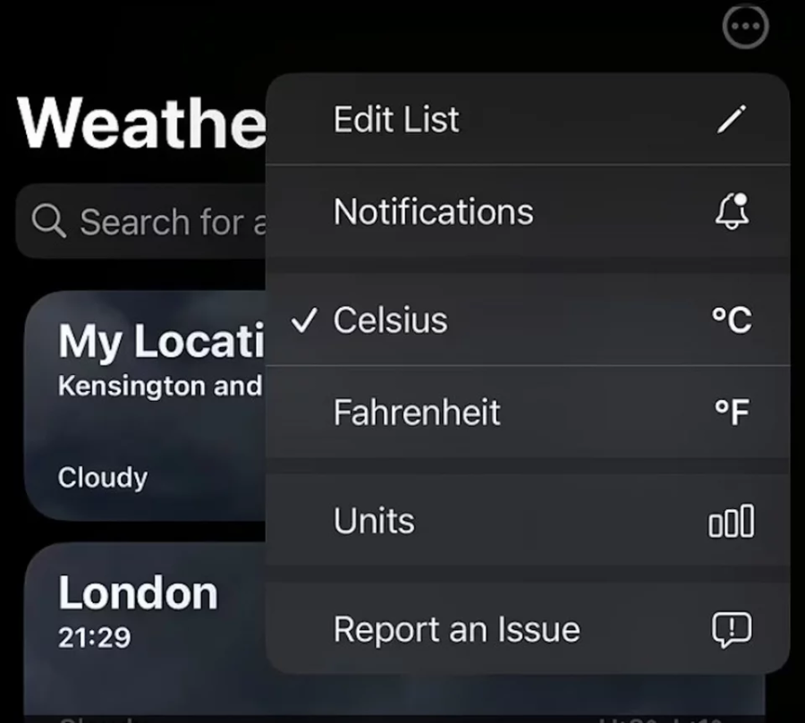 Στη συνέχεια, στην εφαρμογή καιρού, ο χρήστης κάνει κλικ στο εικονίδιο με τις τρεις σειρές κάτω δεξιά και, στη συνέχεια, στο εικονίδιο με τις τρεις τελείες πάνω δεξιά.
