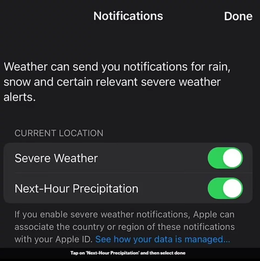 Πατάει στο «Next-Hour» (Βροχόπτωση της επόμενης ώρας) και, στη συνέχεια, πατάει done (τέλος). Από εκεί και έπειτα θα λαμβάνει τις σχετικές ειδοποιήσεις για τον καιρό.