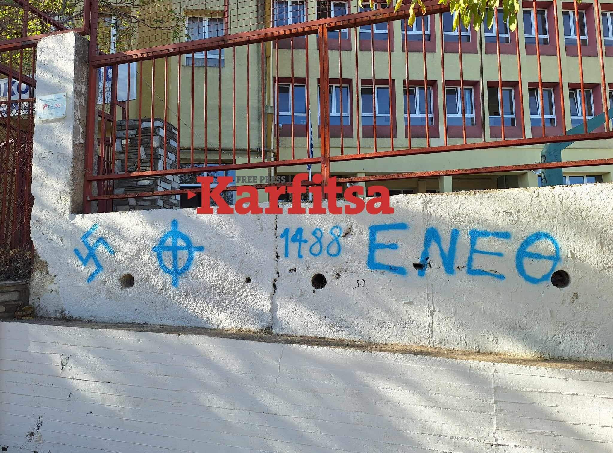 Εικόνες ντροπής έξω από το 2ο Γυμνάσιο Νεάπολης στη δυτική Θεσσαλονίκη, όπου άγνωστοι έγραψαν νεοναζιστικά και εθνικιστικά συνθήματα και σύμβολα, ...