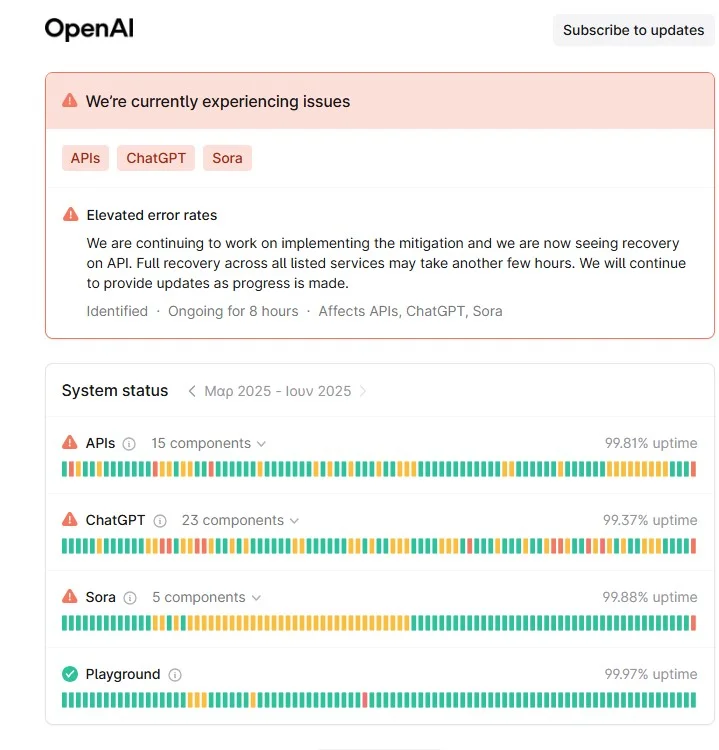 Από το μεσημέρι της Τρίτης (10/6) σύμφωνα με όσα έχουν γίνει γνωστά, το ChatGPT έχει σημαντικά προβλήματα, ενώ η εταιρεία OpenAI έχει δηλώσει πως εργάζεται για την αποκατάσταση και έχει εντοπίσει την αιτία της δυσλειτουργίας.